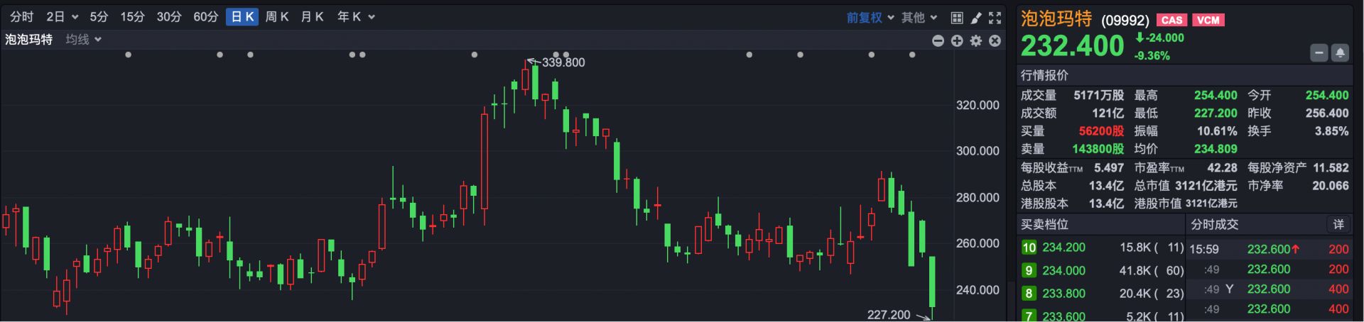 焦点公司方面,泡泡玛特(09992.HK)盘中一度下跌超10%,最终收盘下跌9.36%,报232.4港元,创出近期新低。这也是泡泡玛特4月以来最大单日跌幅。
