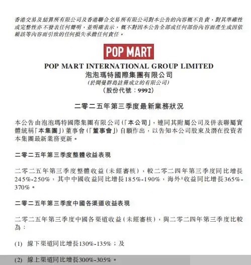 10月21日盘后,潮玩巨头泡泡玛特(09992.HK)披露的2025年第三季度业务数据堪称亮眼——整体收益同比激增245%-250%,海外市场增速更是高达365%-370%,美洲地区同比增长甚至突破12倍。