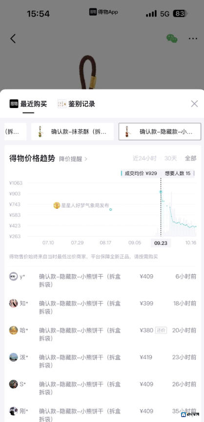 三季度以来,泡泡玛特多款新品更是成为市场焦点,10月初推出的万圣节“WHY SO SERIOUS”系列盲盒,线上开售数分钟即告售罄,其中LABUBU大隐藏款“月影假面”在千岛平台的成交价高达1775元,截至10月24日还维持在1178元的成交均价,较159元的发售价溢价6.35倍。更早前的星星人系列表现更为夸张,得物APP显示,隐藏款“小熊饼干”最高成交价从59元上涨至929元,溢价近15倍。即便头部IP的老款产品价格有所回落,如SPACE·MOLLY二手价从万元跌至千元,但新品的溢价狂欢仍在持续。