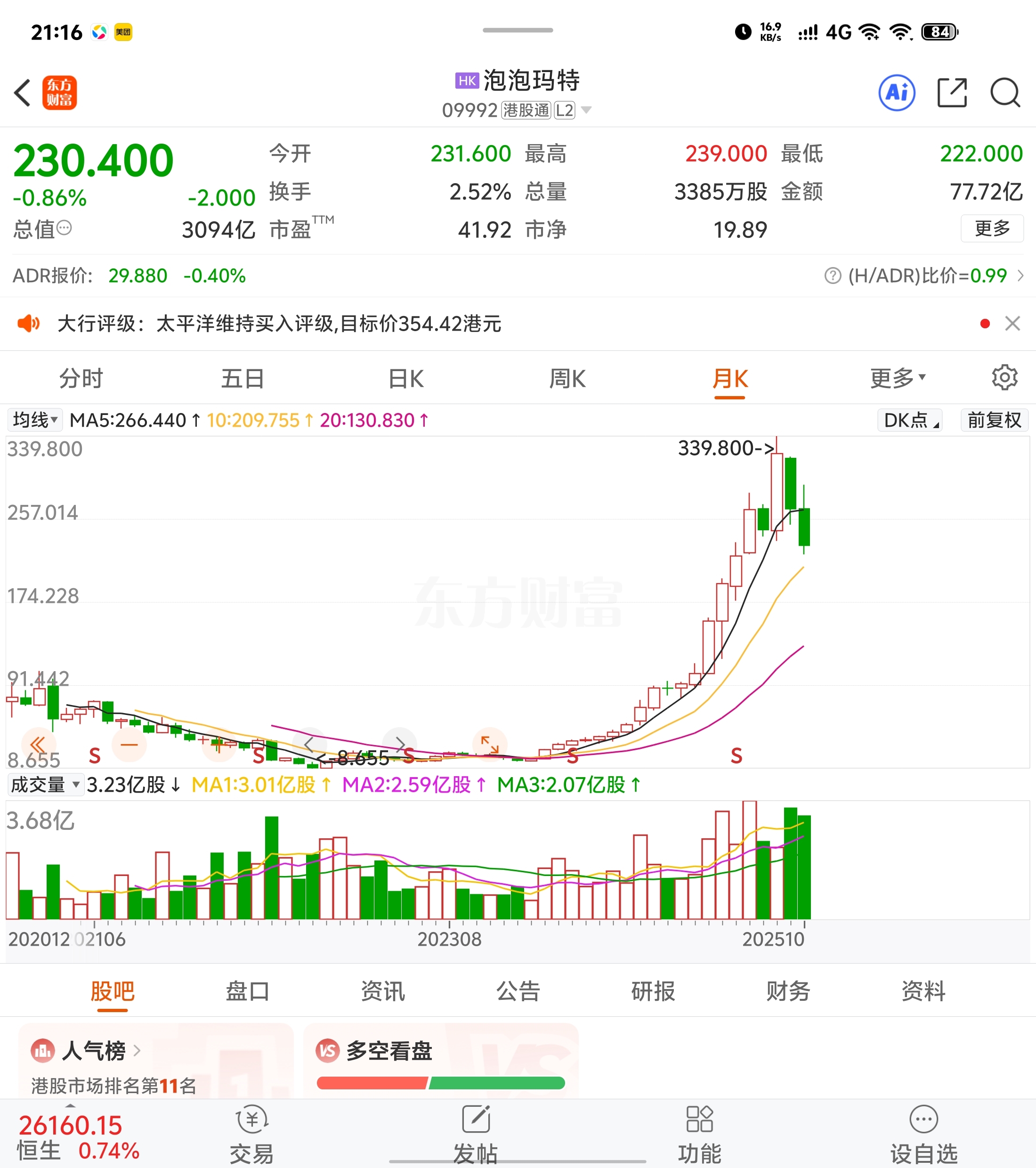 $泡泡玛特(HK|09992)$ 这月线趋势,不用分析都知道会到哪!