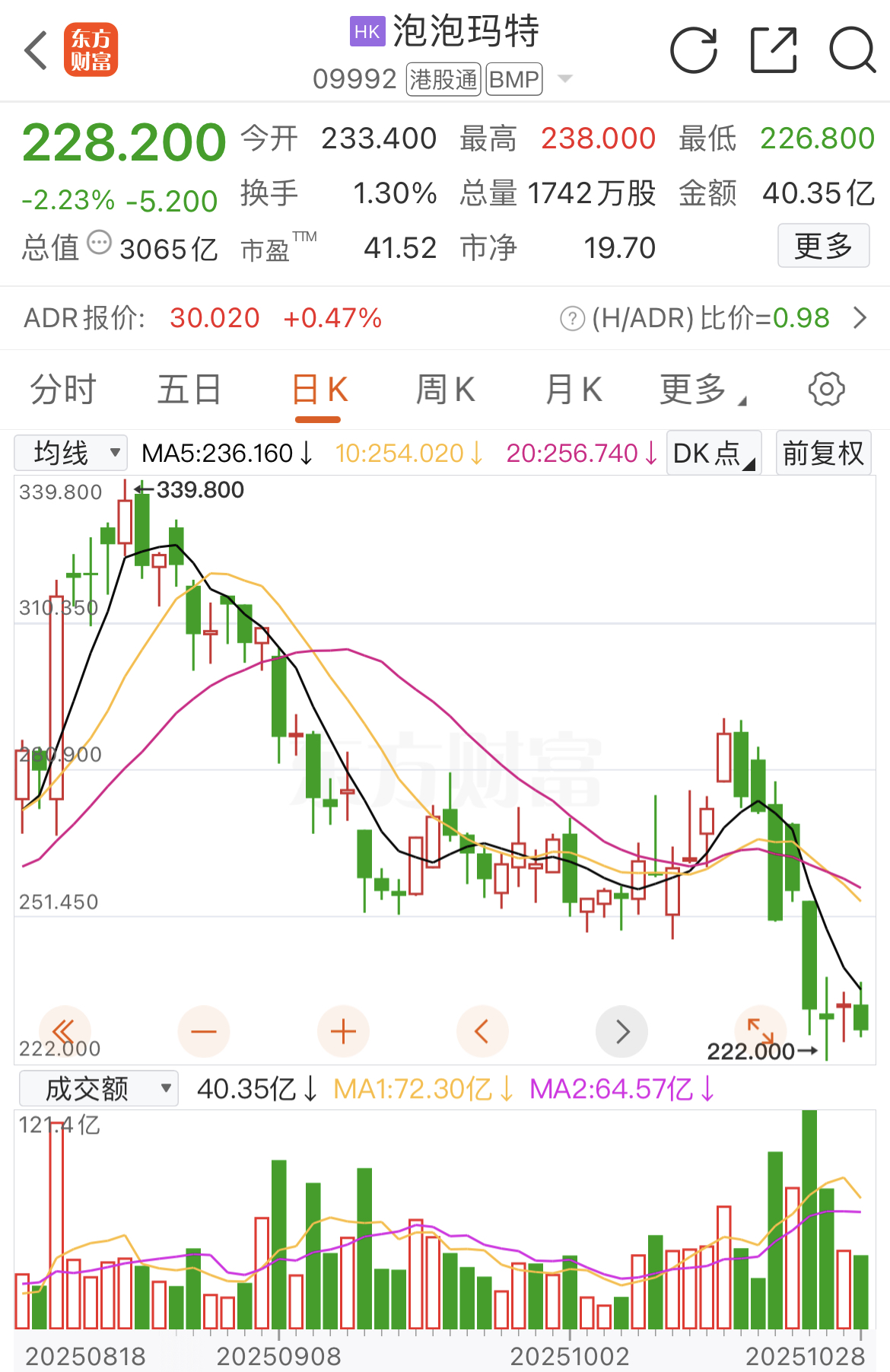 泡泡玛特两个月股价从339港币跌至今日228港币,股价调整深度回调33%,这并非个例,而是当前港股消费板块整体波动的一个缩影。三季报发布前后,港股消费类企业普遍面临估值再平衡。$泡泡玛特(HK|09992)$