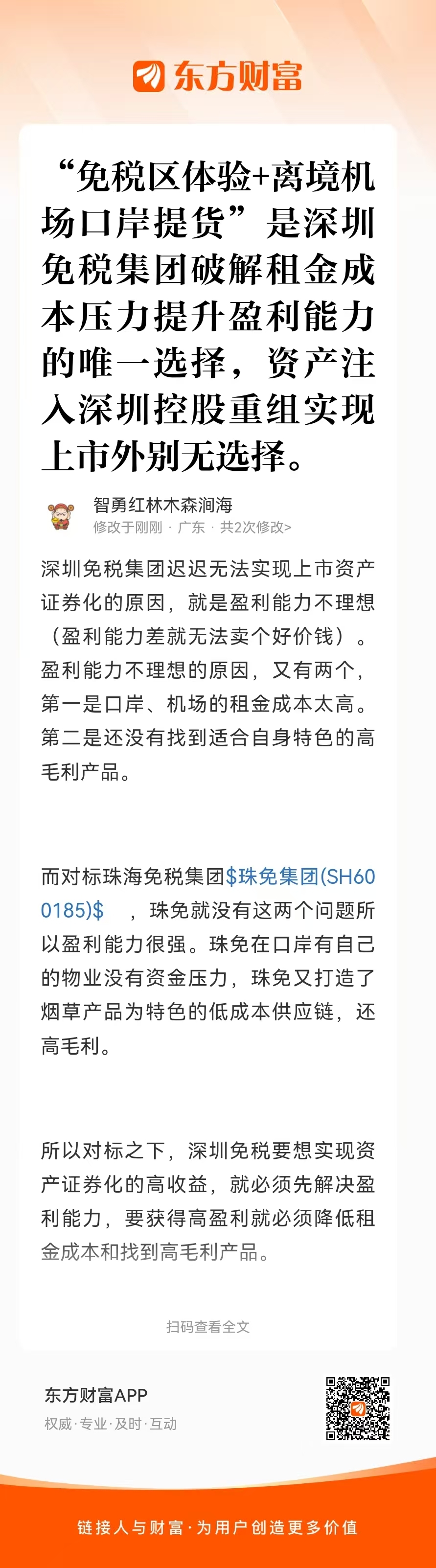 $泡泡玛特(HK|09992)$ “免税区体验+离境机场口岸提货”是深圳免税集团破解租金成本压力提升盈利能力的唯一选择,资产注入深圳控股重组实现上市外别无选择。深圳控股十倍估值暴涨一起见证。$优必选(HK|09880)$ $深圳控股(HK|00604)$