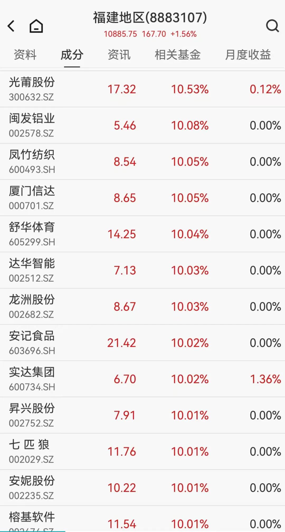 福建板块再度爆发,安记食品5连板,舒华体育、福建金森等10余股涨停。