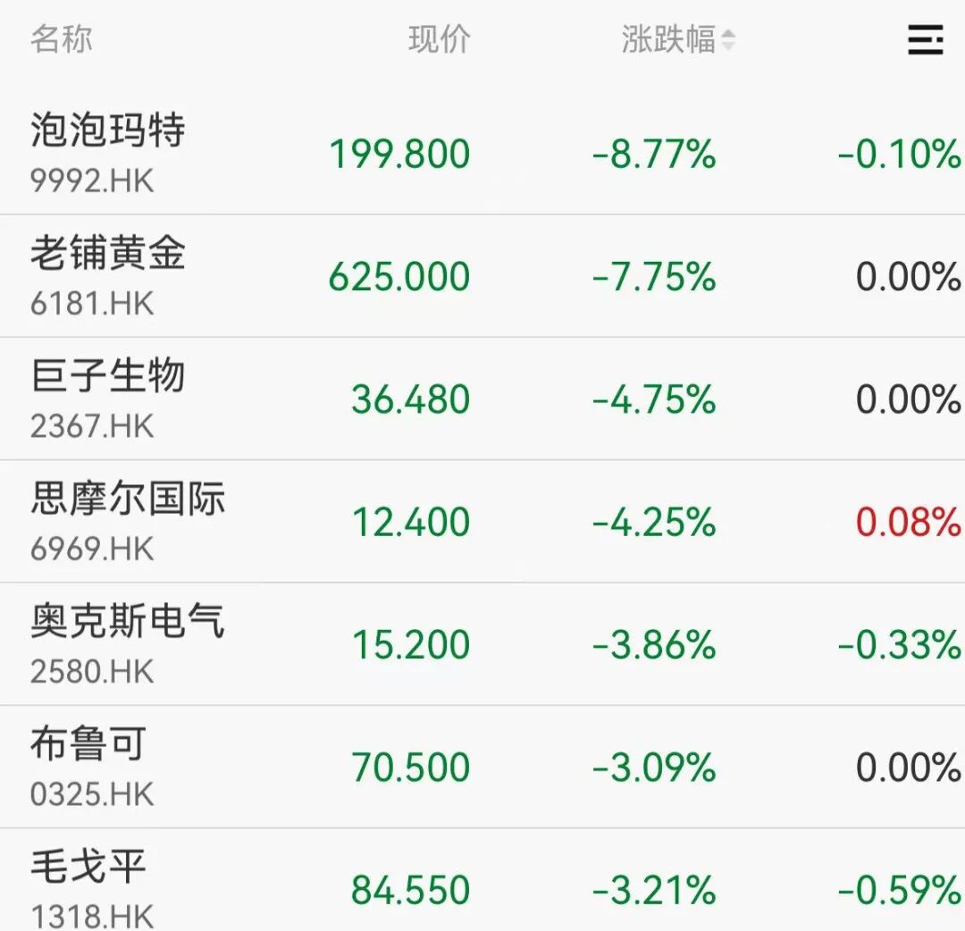 港股方面,消费股午后异动下跌,截至15:15左右,泡泡玛特大跌近9%,老铺黄金跌近8%,多只相关个股跌超3%。