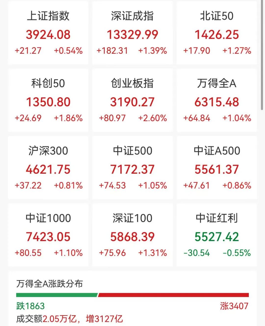 12月8日市场高开高走,截至收盘,沪指涨0.54%,深成指涨1.39%,创业板指涨2.6%。沪深两市成交额2.05万亿,较上一个交易日放量3127亿。全市场超3400只个股上涨。