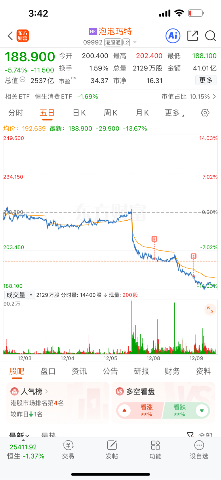 $泡泡玛特(HK|09992)$ 昨天真是抽筋,,200买了你,,现在中芯,华虹跌了,,没钱补仓了