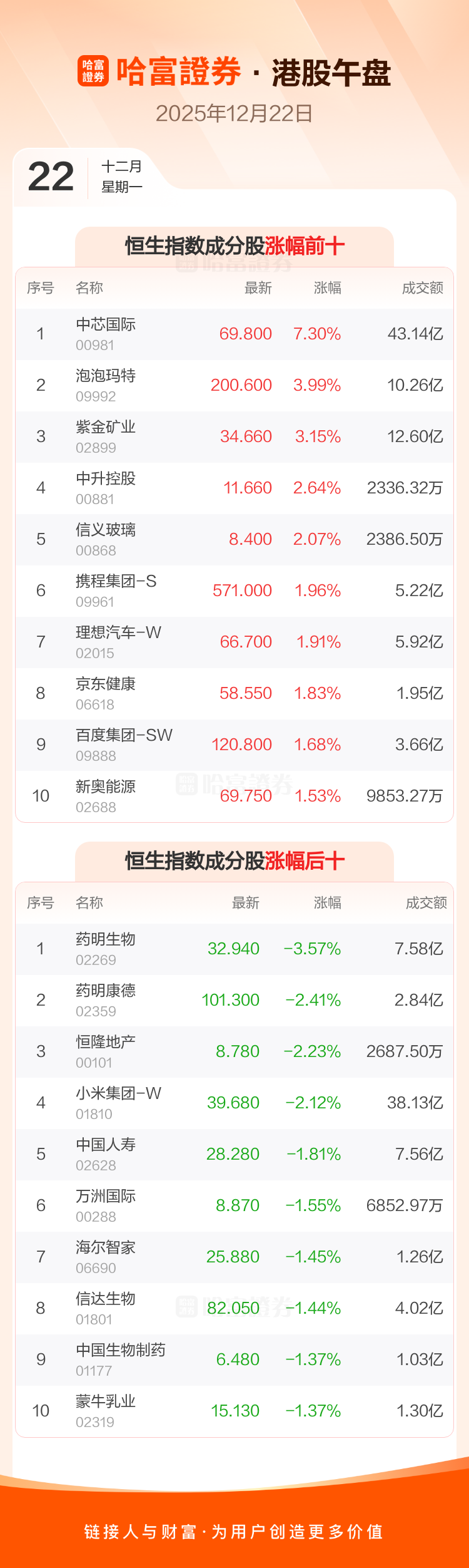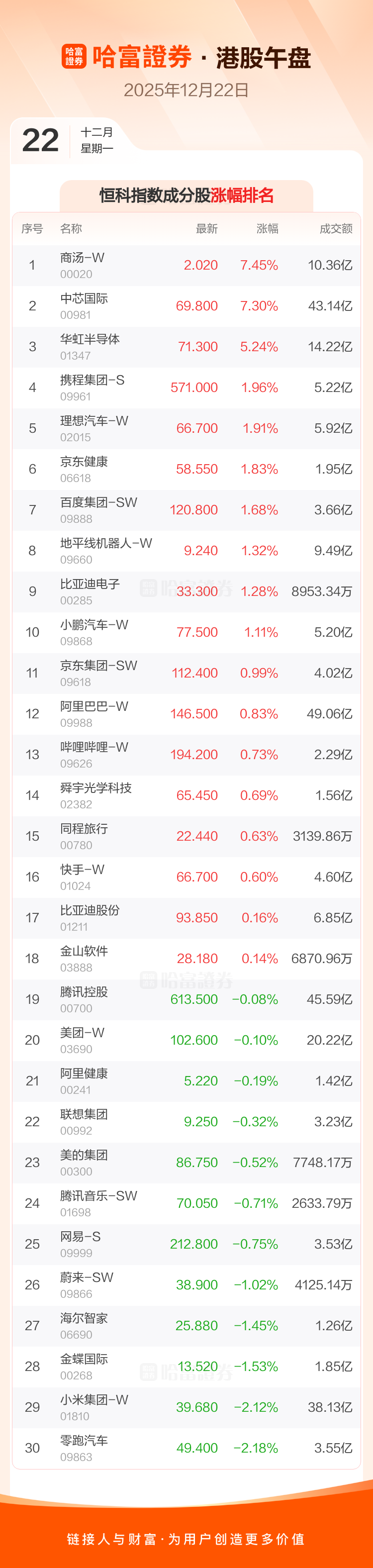 港股12月22日午盘走高,恒生指数收报25742.24点,涨51.71点,涨幅0.2%;恒生科技指数收报5528.05点,涨49.01点,涨幅0.89%。恒生指数成分股中中芯国际、泡泡玛特、紫金矿业涨幅居前,药明生物、药明康德、恒隆地产跌幅靠前。恒生科技指数成分股中商汤-W、中芯国际、华虹半导体涨幅居前,零跑汽车、小米集团-W、金蝶国际跌幅靠前。