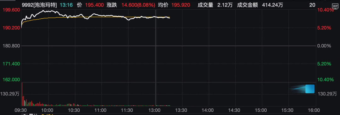 1月20日上午,泡泡玛特(09992.HK)大涨,盘中一度涨超10%。截至记者发稿,泡泡玛特涨逾8%。港股新消费概念集体走强,布鲁可盘中一度涨超7%。