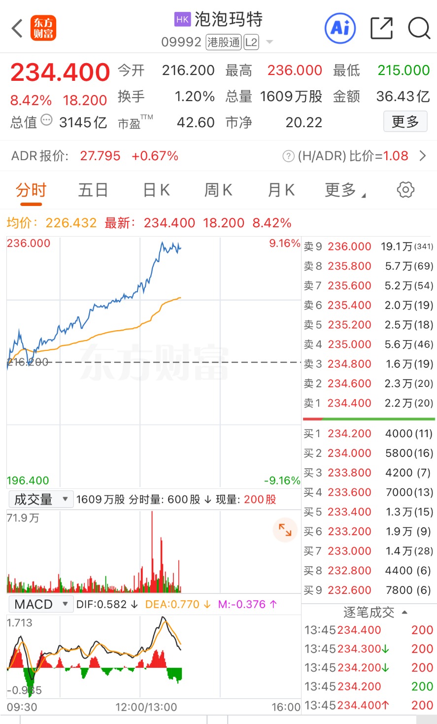 上证报中国证券网讯1月28日,泡泡玛特午后拉升,一度涨超9%,截至13时45分,涨8.42%,报234.40港元/股。