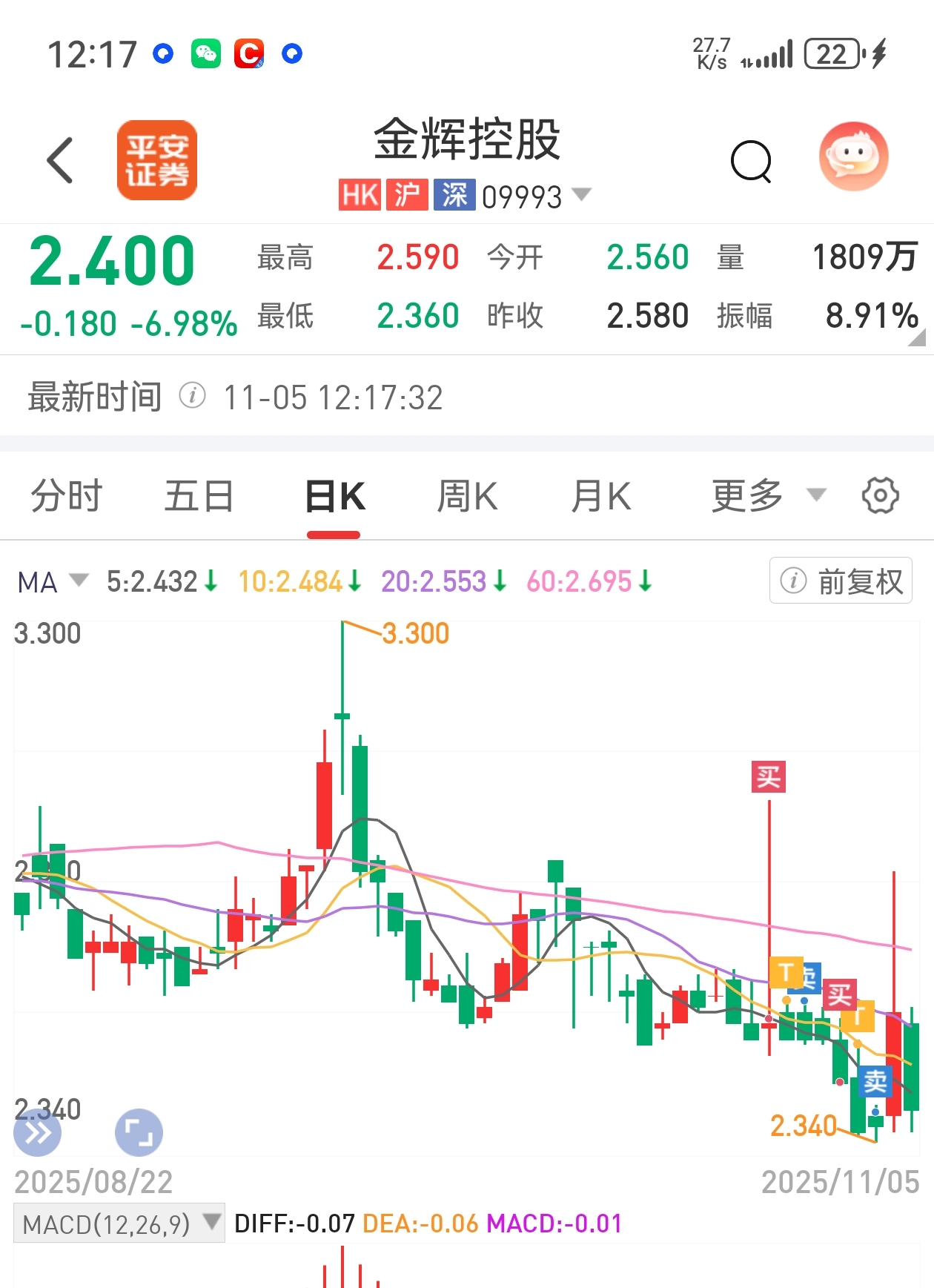 $金辉控股(HK|09993)$ 连着买卖好几天每天一两个点 刚好昨天没买一下 起飞了 一下又回到解放前了 尾盘又可以买了