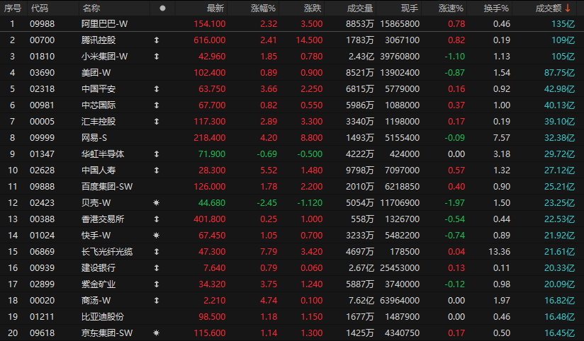 盘面上,大型科技股集体上涨助力市场上行,网易涨超4%,腾讯控股、阿里巴巴涨超2%,小米、百度、京东、快手涨超1%;电力设备股走强,东方电气涨超13%;大金融股(银行、保险、券商)亦全线上涨,中国太保、中信证券、中国银河、交通银行涨幅靠前,香港本地股银行股渣打集团、汇丰控股再度刷新历史新高,汇丰市值更是站上2万亿港元;白银、黄金价格继续飙涨,黄金股活跃,中国白银集团涨近6%;餐饮股、内房股因政策利好飘红,影视股、航空航天、乳制品、脑机接口概念、手游股等纷纷上涨。