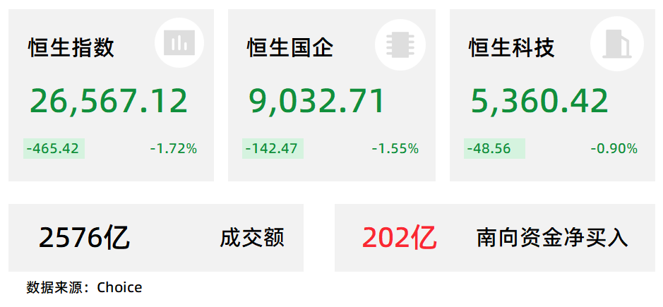 2月13日,受隔夜美股大跌影响,港股三大指数集体下跌,恒生科技指数跌0.9%,恒生指数、国企指数分别下跌1.72%及1.55%。