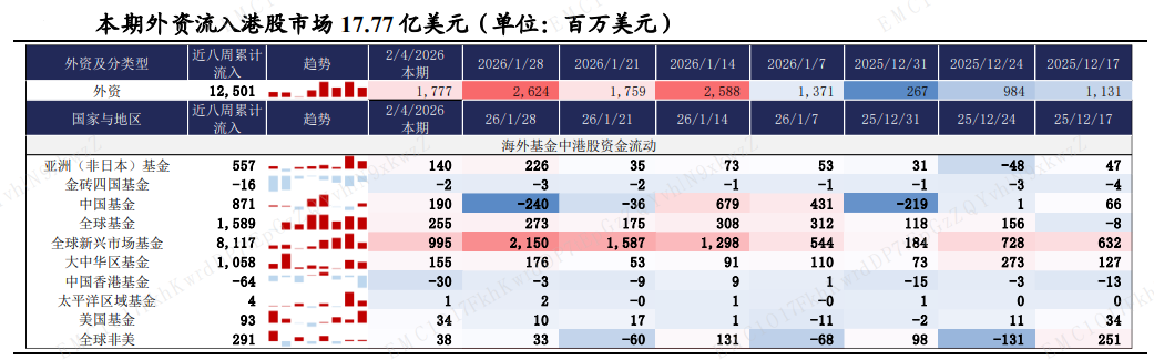 本期恒生指数收跌3.0%,全球主要市场涨跌互现,道琼斯工业指数(+2.5%)涨幅居前。资金维度:1)南下资金净买入额上升至 560.7 亿元,处 2022 年以来 97%分位(MA5); 2)本期(截至 2/4)发达市场主动/被动资金净流动-3.7 亿/255.3 亿美元,新兴市场主动/被动资金净流动 23.2 亿/65.1亿美元。仅外资口径看,全球外资边际流入非美发达市场和中国市场,英国(+21.5 亿美元)、中国(+21.0 亿美元)流入规模居前。含各国内资的全球整体流动看,美国/韩国获流入居前,中国流出规模减小。北美基金获净申购,美股能源/工业基金净申购居前。