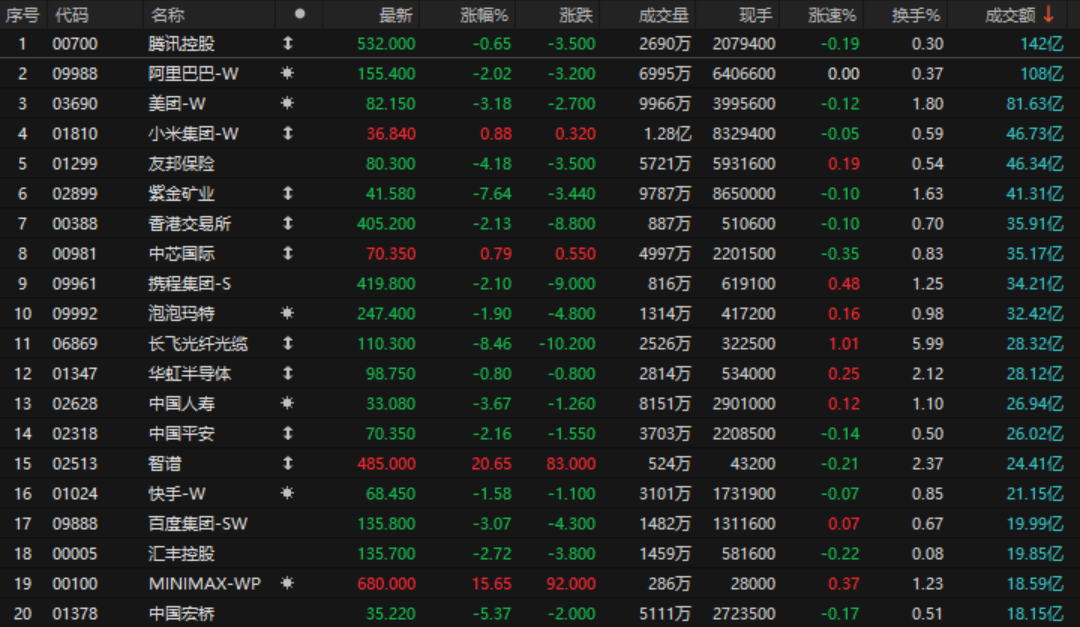 港股成交额前二十