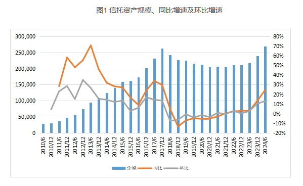 近年来,信托业转型效果逐步显现,2022年底和2023年底的信托资产规模分别为21.14万亿元和23.92万亿元,分别同比增长2.87%和13.15%;截至2024年末,全行业信托资产规模余额更是高达29.56万亿元,较2023年末增加5.64万亿元,增幅达23.58%。
