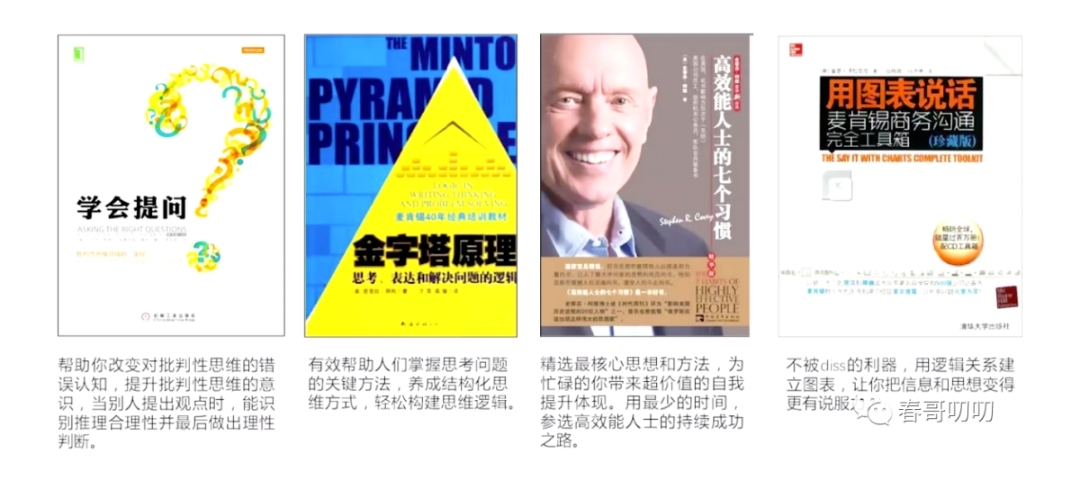 美团四大名著:《高效能人士的七个习惯》《金字塔原理》《学会提问》《用图表说话》。
