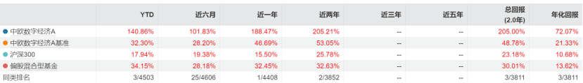 再来看中欧数字经济$中欧数字经济混合发起A(OTCFUND|018993)$,也是个人关注比较久的一只基金。资料显示,该基金由中欧科技战队成员冯炉丹担纲,Wind数据显示,截至9月30日,该基金年内、近一年、成立以来收益率分别为140.86%、188.47%和205%,同类排名分别为3/4498、1/4408和3/3811。