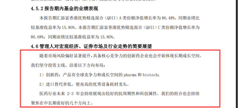 在今年的一、二季报和中报中,基金经理对未来市场的展望均有着相同的表述:“报告期内,我们对组合的重仓方向、结构、个股调整不多。随着市场风险偏好显著提升,具备核心竞争力的创新药企业也会开始体现长期成长空间。我们坚守投资主线、沿着以下方向布局:1)创新药:产品有全球竞争力和成长空间的 pharma 和 biotech;2)进口替代率低,壁垒高的优秀设备耗材龙头。”