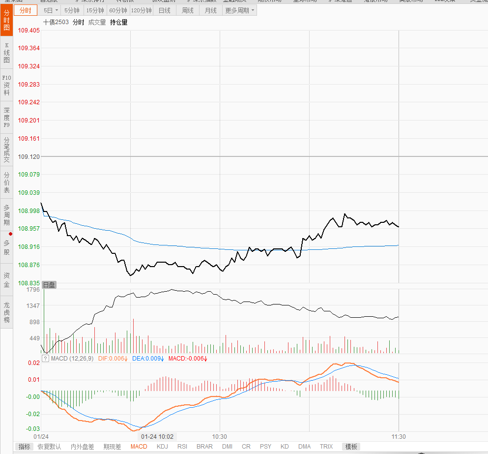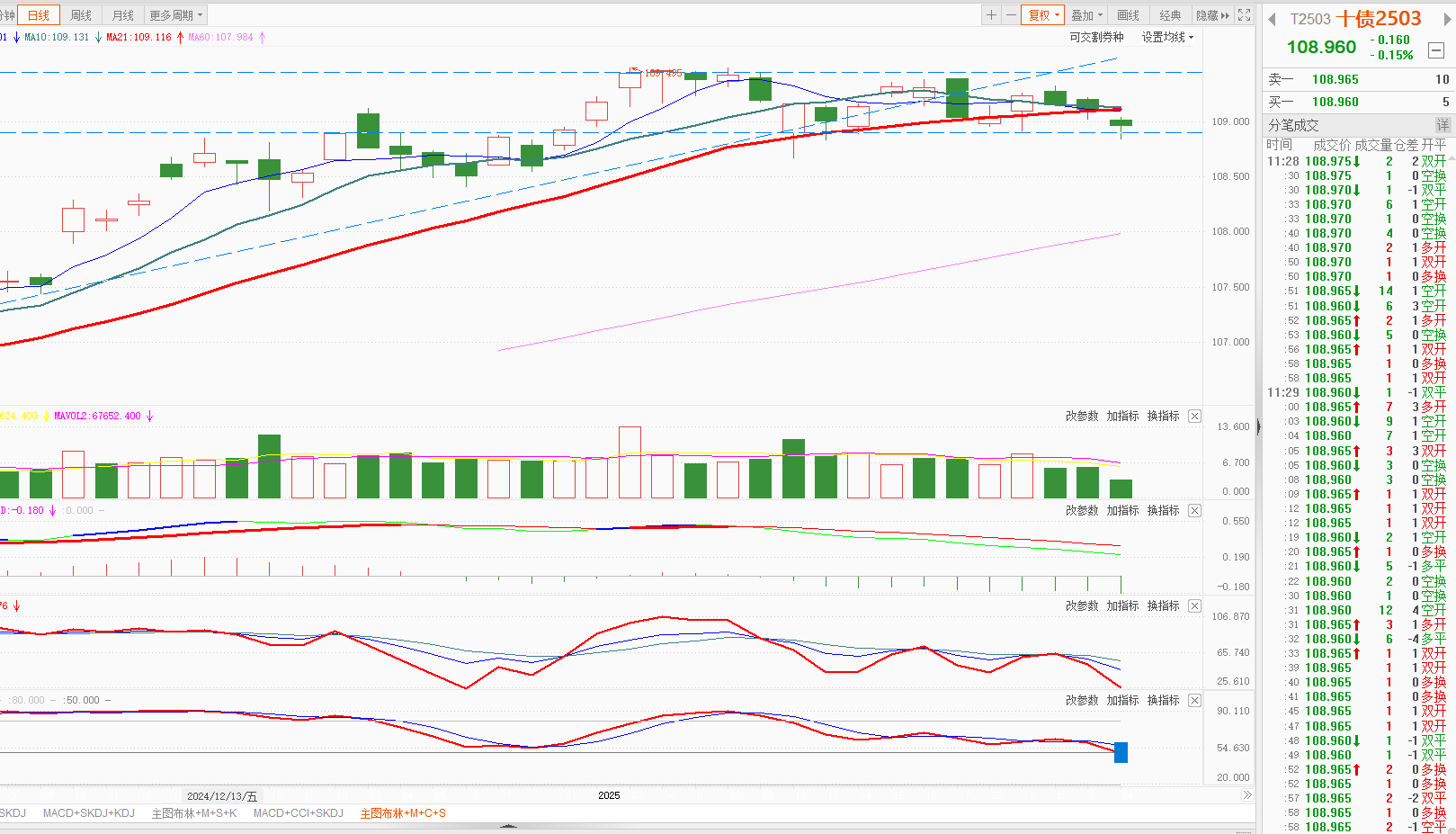 技术指标:早盘10年国债期货低开低走,10点后小幅回升,大跌 0.15%,KDJ死叉,MACD死叉绿柱放大,日K线跌破20日均线。