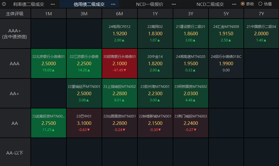 绿多红少,雨天。AAA+、AA+等级信用债表现不佳。