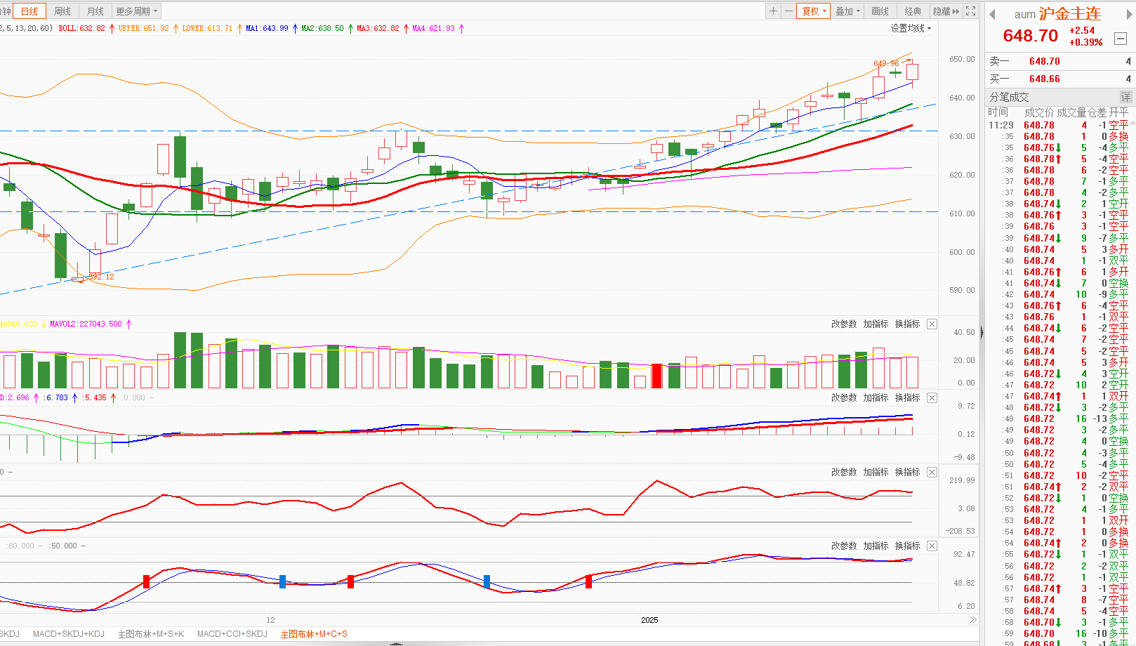 沪金主连:涨0.39%,日K线在5日均线之上,今天沪金继续大涨,最高649.6,已基本达到司机前期说的650,后市可能继续上涨。但司机不贪,今天准备先止盈减仓一半。