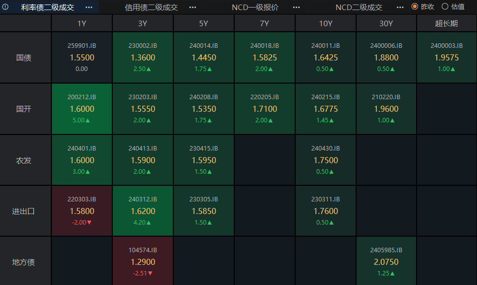 绿多红少,雨天。1-7年期利率债跌幅更大一点。