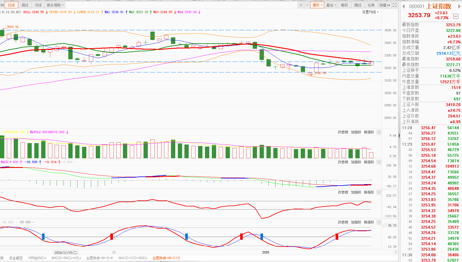 上证指数:涨0.73%,KDJ金叉,MACD金叉红柱放大,今天日K线终于冲上20日均线,后市看能否站稳后继续上行。