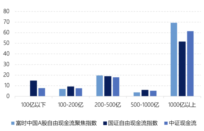 相比国证自由现金流指数,富时中国A股自由现金流聚焦指数偏向大市值风格,1000亿以上的股票加权占比约70%。大市值权重占比较高,高于同类的国证自由现金流指数、中证全指自由现金流指数,同时也高于红利指数。