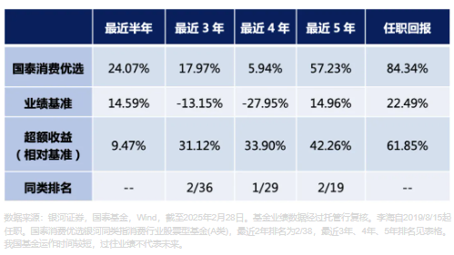 国泰消费优选股票型证券投资基金(成立日期2019/01/17,业绩比较基准为85%中证内地消费主题指数收益率+15%中证综合债指数收益率,李海自2019/08/15管理至今):2020-2024业绩/基准数据:54.09%/54.62%,-0.03%/-9.70%,-11.38%/-13.80%,1.19%/-11.69%,16.35%/5.71% 。