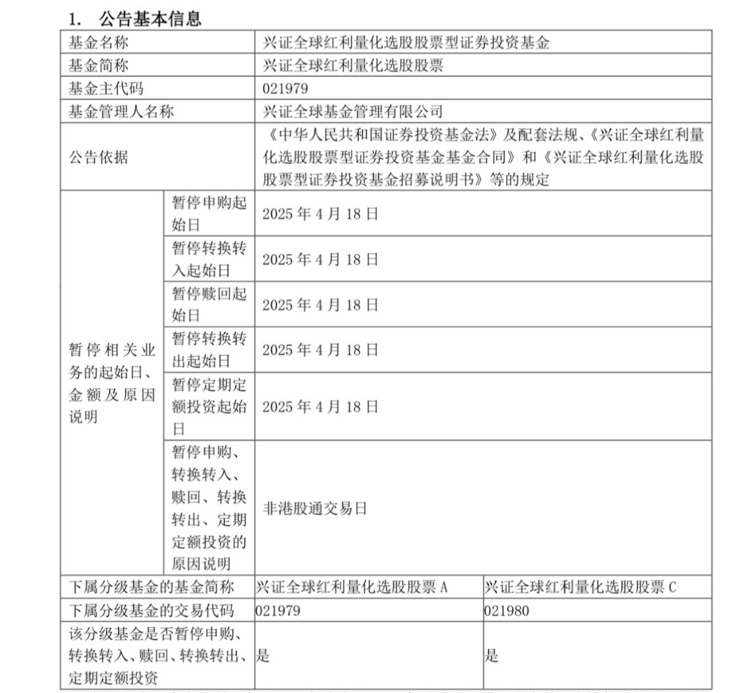 注:根据《兴证全球红利量化选股股票型证券投资基金基金合同》约定,若本基金参与港股通交易且该工作日为非港股通交易日,则基金管理人可根据实际情况决定本基金是否暂停申购及赎回业务。