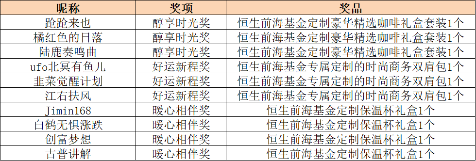 号外!!由于大家参与激情高涨,小编的领导深受感动,决定在不久的将来(快的话可能就在未来一两周,小编尽量争取!!!)继续给大家谋更多福利!别忘了搜“恒生前海基金财富号”,加“关注”,更多福利活动等你来!本次没有抽中的小伙伴千万不要气馁噢,您的运气可能在下一次活动中出现!