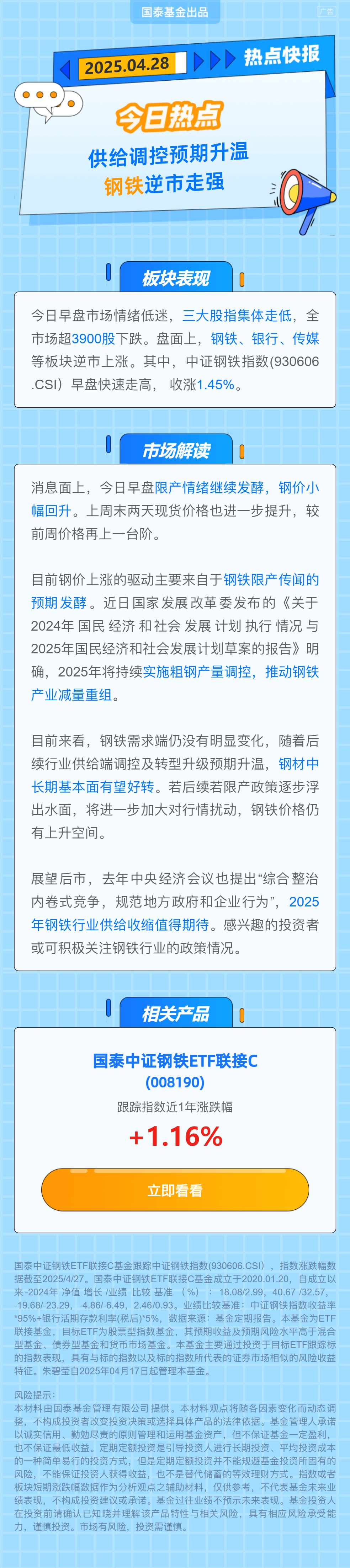 $国泰中证钢铁ETF联接A(OTCFUND|008189)$$国泰中证钢铁ETF联接C(OTCFUND|008190)$$国泰中证钢铁ETF联接E(OTCFUND|022586)$