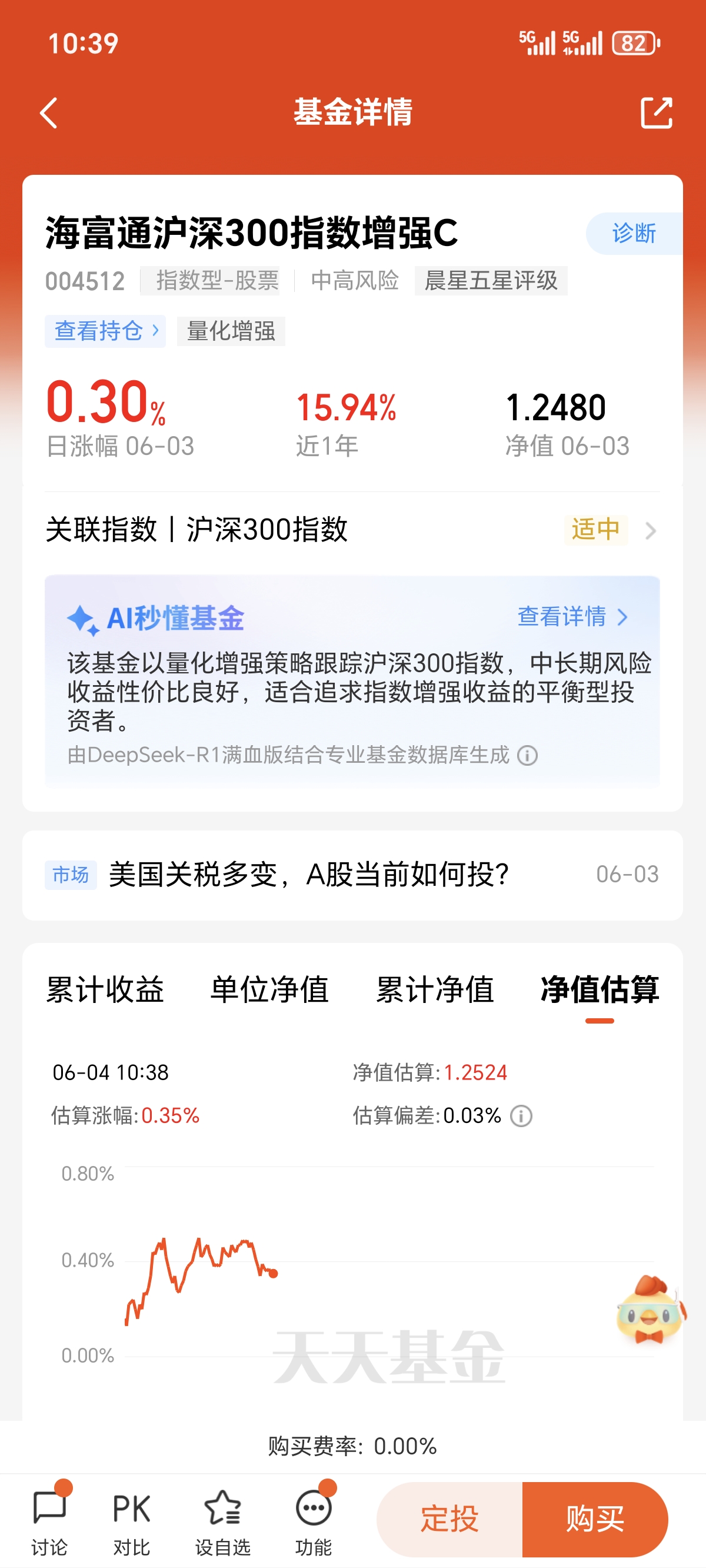 今日大盘延续了昨日的上涨节奏,市场情绪面回暖明显,但当前板块轮动仍然很快,所以在布局时,均衡配置才会更加稳妥!而在选择时基金之时,我会倾向于沪深300指数宽基指数基金,作为市场重要的风向标,这类产品覆盖面极广,但波动相对于小,阶段性投资性价比比较高,长期持有也会很有保障!我今日准备加仓一波$海富通沪深300指数增强C(OTCFUND|004512)$作为一款量化增强的沪深300基金,持仓成分股以金融、科技、制造、消费等龙头企业为主!