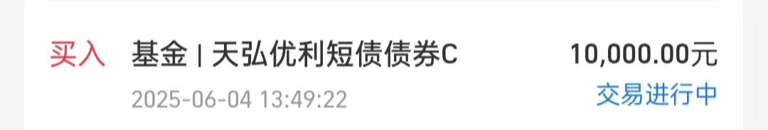 个人上车短债基:$天弘优利短债发起C(OTCFUND|014925)$,+10000元。7免。