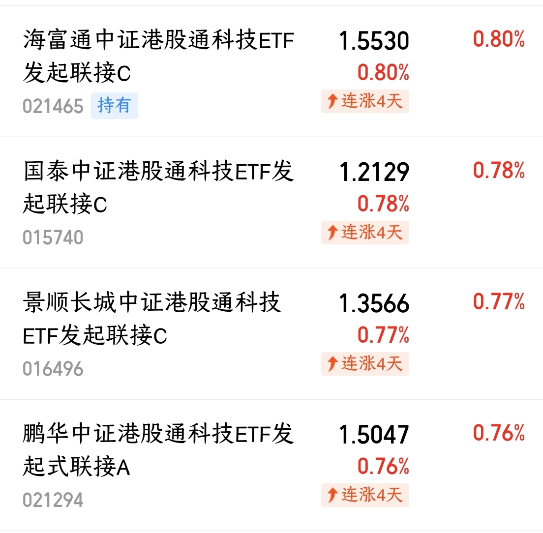 $海富通中证港股通科技ETF发起联接C(OTCFUND|021465)$今日上涨0.8%