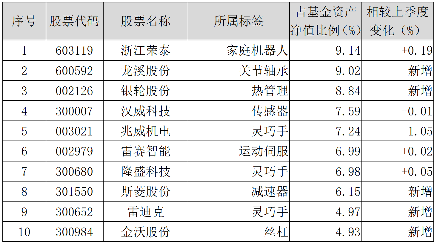 总体来说,本基金上季度相较上上季度,有一定的仓位变化,但仍旧是重点布局在人型机器人的关键技术:灵巧手和大小脑、传感器等部分。
