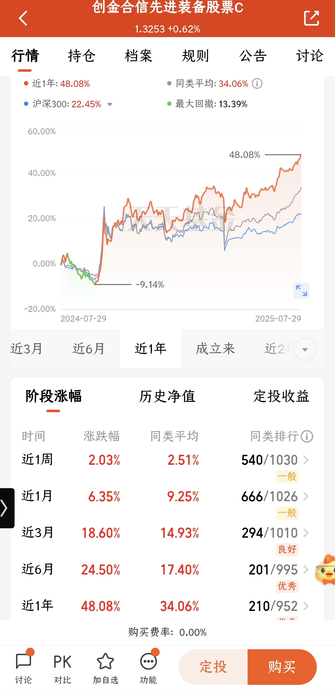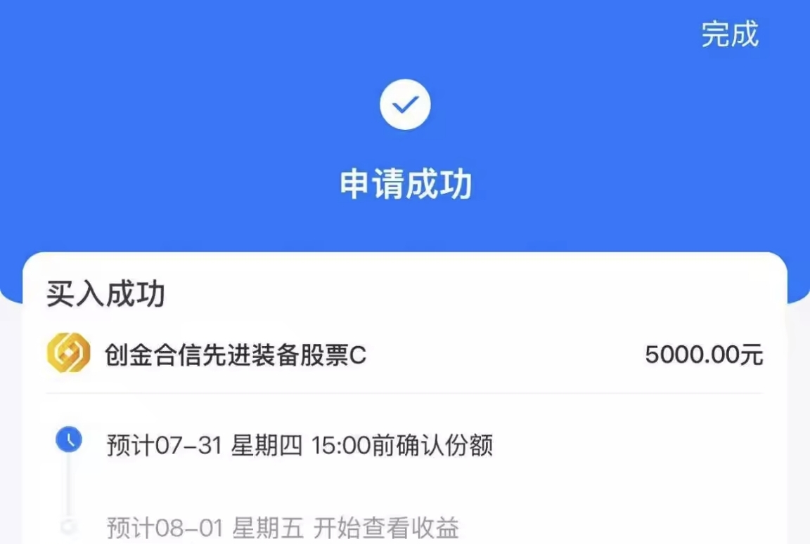 经过仔细研究,我决定加仓创金合信先进装备基金。该基金近期表现相当抢眼,近3个月涨幅18.6%,近一年涨幅更高达48.08%,两项数据都大幅跑赢同类平均水平,排名也位居前列。今天果断加仓5000元,期待军工板块后续行情能够持续发力。