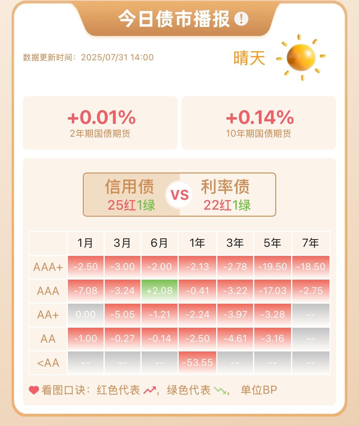 债市目前总体“晴天”,2年期、10年期国债上涨,信用债、利率债均涨多跌少。