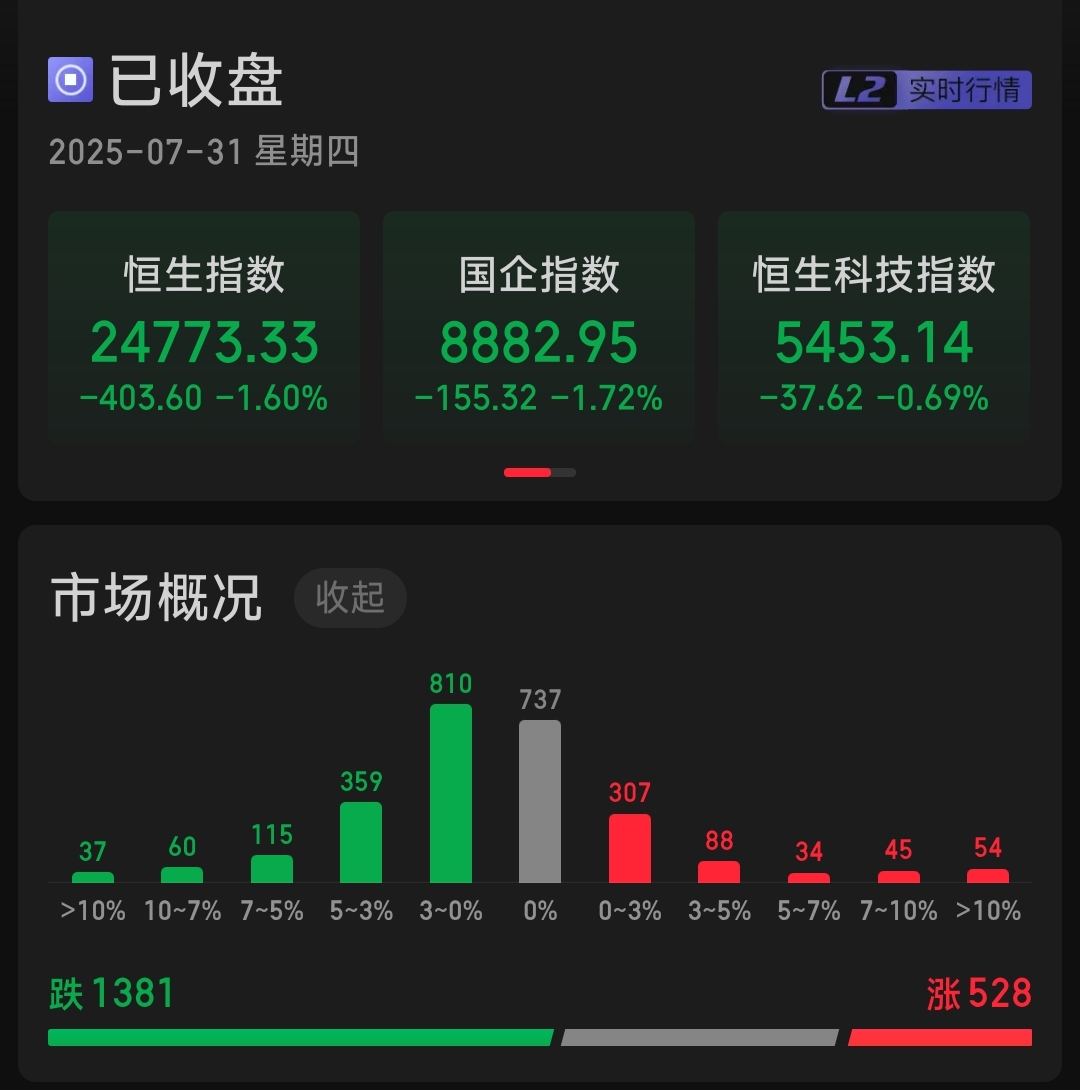 恒生指数下跌1.60%,国企指数下跌1.72%,恒生科技指数下跌0.69%。528只个股上涨,1381只个股下跌。南下资金,净买入131.26亿港元。