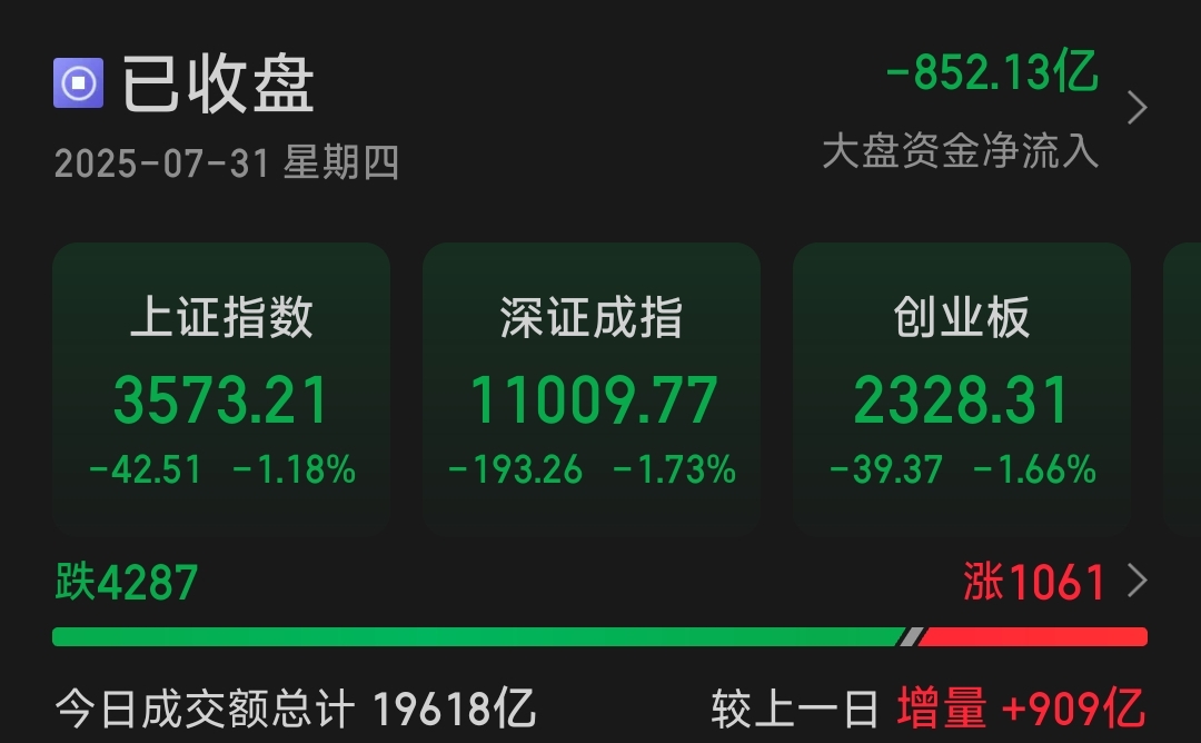 指数表现,沪指跌1.18%,深成指跌1.73%,创业板指跌1.66%。个股跌多涨少,全市场超4200只个股下跌。今日成交额总计1.96万亿,较上个交易日增量909亿。