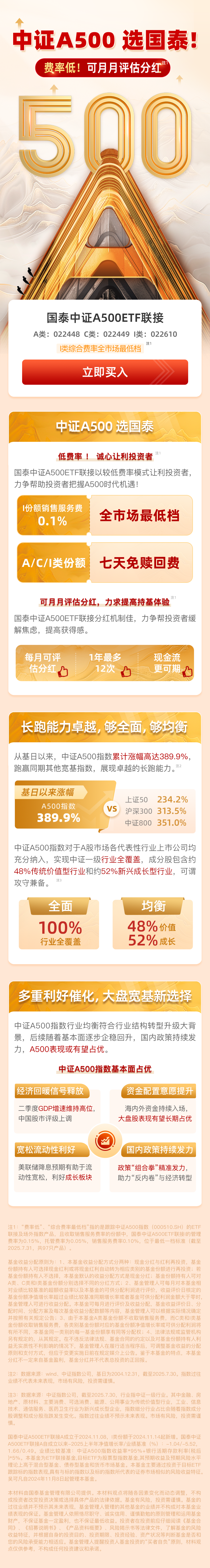 $国泰中证A500ETF发起联接A(OTCFUND|022448)$$国泰中证A500ETF发起联接C(OTCFUND|022449)$$国泰中证A500ETF发起联接I(OTCFUND|022610)$