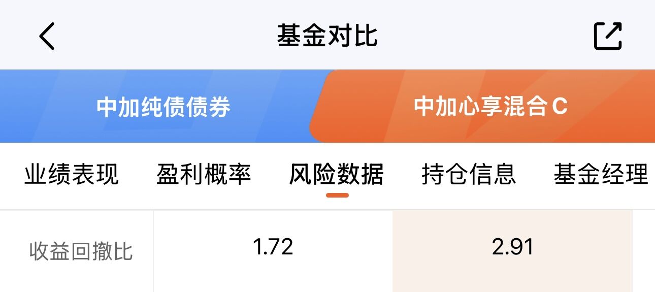 回撤方面也不用担心,毕竟权益仓位也就不到10%,大部分还是债券打底。收益回撤比上,中加心享性价比也比纯债更高。