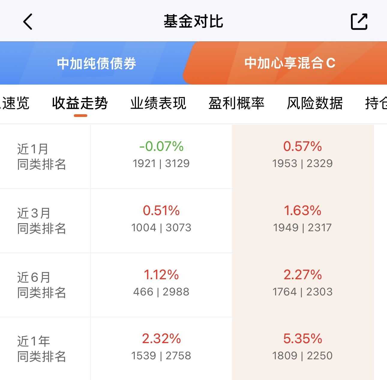 他们家的 $中加心享混合C(OTCFUND|002533)$,就是一只固收增强基,近3月、近6月等各个时间区间收益都领先于纯债,近1年涨近5.4%,跑赢中加纯债3个多点。