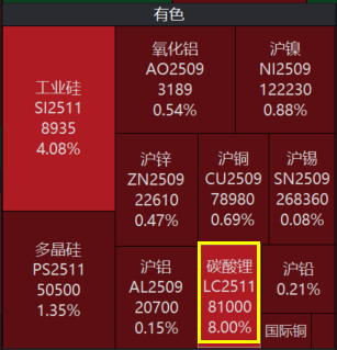 消息面上,某电池龙头在互动平台表示,公司在宜春项目采矿许可证8月9日到期后已暂停了开采作业,正按相关规定尽快办理采矿证延续申请,待获得批复后将尽早恢复生产。有消息称该公司枧下窝锂矿停产,为期至少三个月。券商研究员表示,该矿山相配套的三大冶炼厂合计产能10万吨LCE,若实际发生停产,则影响月度供应约0.8万吨LCE,约占国内碳酸锂月度供应8%,影响量级较大,对短期价格有较强支撑。(注:以上仅作为资讯介绍,不作为个股推荐)