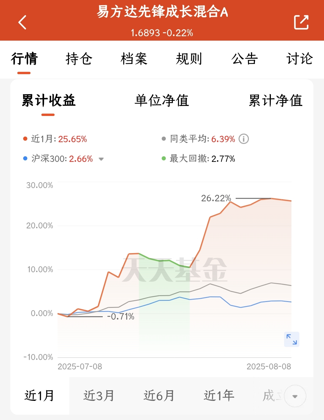 这基金表现太强了,每个阶段涨幅都,既稳又猛。近一月涨幅同类基金产品第一,最近光模块行情全吃到了,还提前重仓了新易盛。现在AI算力需求爆发,未来空间还很大。看好经理操作,继续坚定持有!它就是$易方达先锋成长混合C(OTCFUND|011892)$