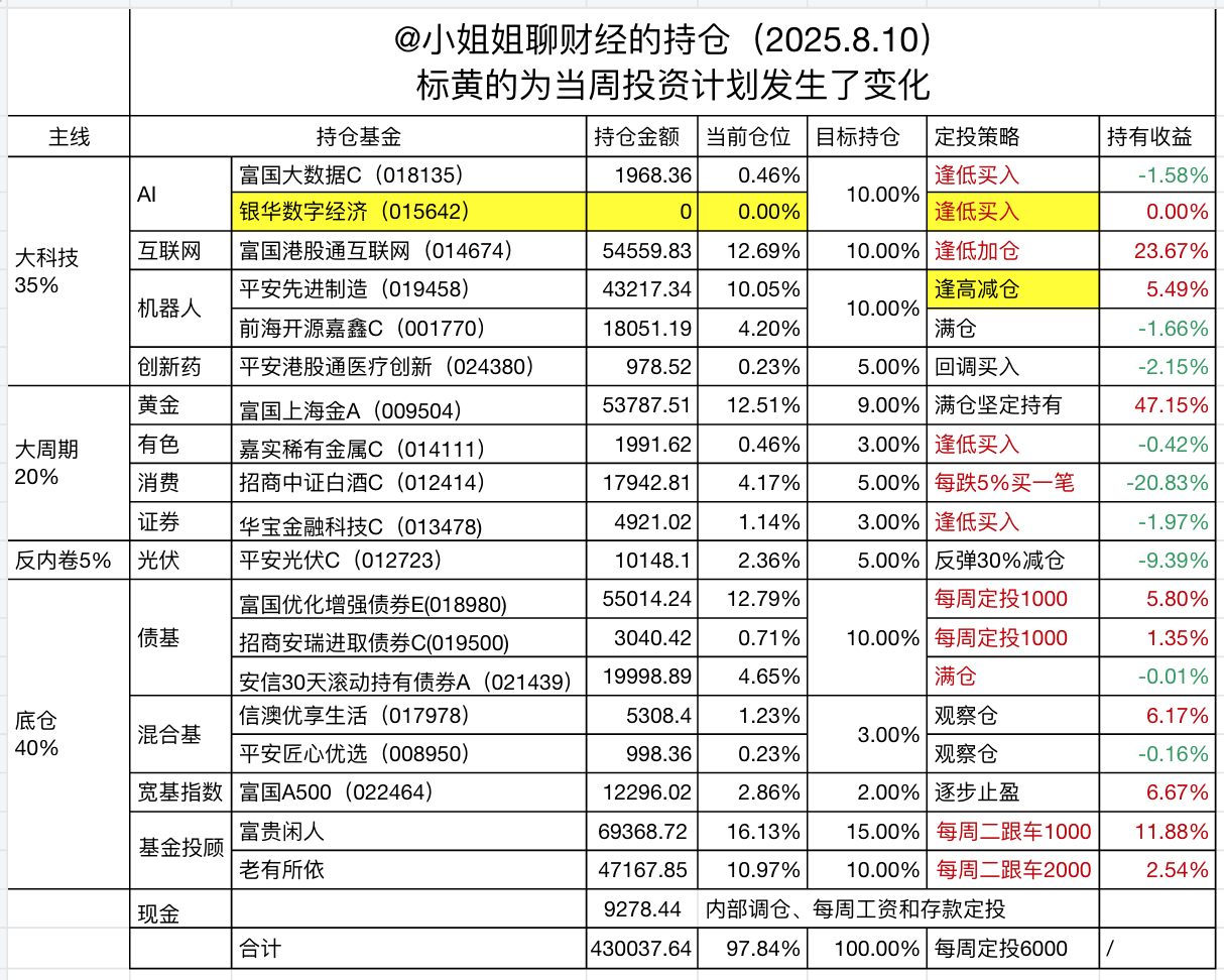 占比35%的大科技,又细分为AI、互联网、机器人、创新药,AI和机器人的区别是,富国大数据是Ai的上游基础设施,包括算力、数据等。准备新建仓的银华数字经济是Ai终端应用方向,都是利润比较丰厚的环节,美股AI应用公司已经证明了,AI确实可以帮助公司改善利润,提高收入。国内这一块目前预期还没有完全起来,但港股的美图秀秀公司股价从底部已上涨近20倍,想象空间很大。机器人不用多说,配置的两只基金一个防守强,一个进攻强,互相配合。互联网和创新药我也归为大科技,因为都是需要科技创新技能,不是传动的制造行业。
