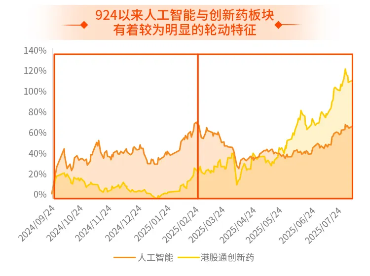数据来源:Wind,2024/9/24-2025/8/5,人工智能指数用中证人工智能产业指数(931071.CSI)代表,港股创新药板块用国证港股通创新药指数(987018.CNI)代表,指数历史走势不代表未来预期,也不预示相关基金的业绩表现。