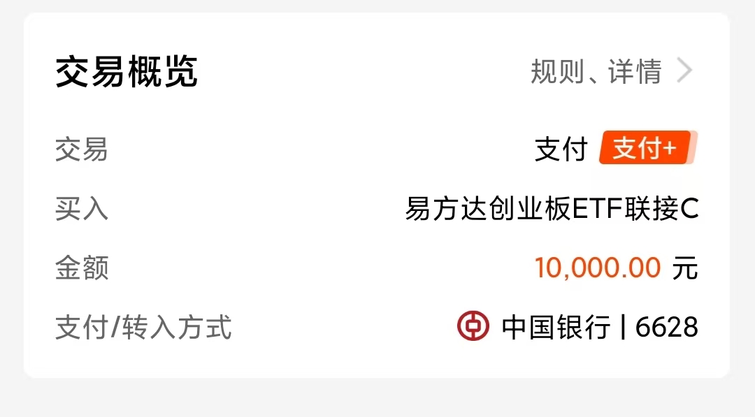 今天行情也太赞了吧,咱可不能错过这一波,今天建仓$易方达创业板ETF联接C(OTCFUND|004744)$入场了。我看这里做为宽基指数,持仓覆盖电力设备、电子、医药生物等新兴产业,与创业板指科技成长属性高度契合。跟踪指数市盈率35.03处于历史34.53%分位,市净率4.31处于38.68%分位,估值压力相对可控。成立8年规模30.34亿元流动性还是不错的~趁着这一波牛市行情入手了~$东财创业板ETF发起式联接A(OTCFUND|009046)$$东财创业板ETF发起式联接C(OTCFUND|009047)$$建信健康民生混合A(OTCFUND|000547)$$融通健康产业灵活配置混合A/B(OTCFUND|000727)$$东财云计算增强C(OTCFUND|012322)$$创金合信数字经济主题股票C(OTCFUND|011230)$$前海开源中证军工指数A(OTCFUND|000596)$