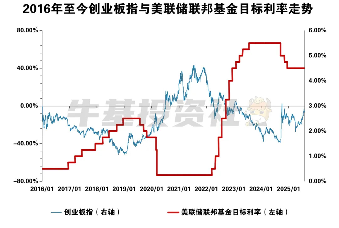 从历史表现来看,创业板指与美联储联邦基金目标利率呈一定负相关关系。
