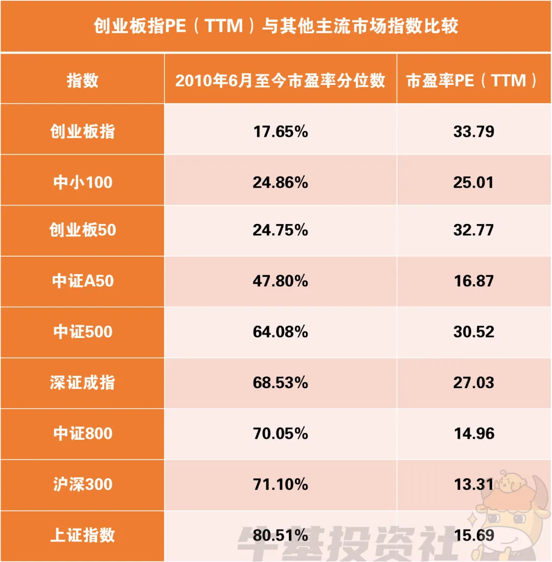 当前创业板指市盈率PE(TTM)为33.79倍,处在指数上市以来17.65%分位数,即估值低于指数历史82%的时间,与其他主流市场指数相比估值水平相对较低。